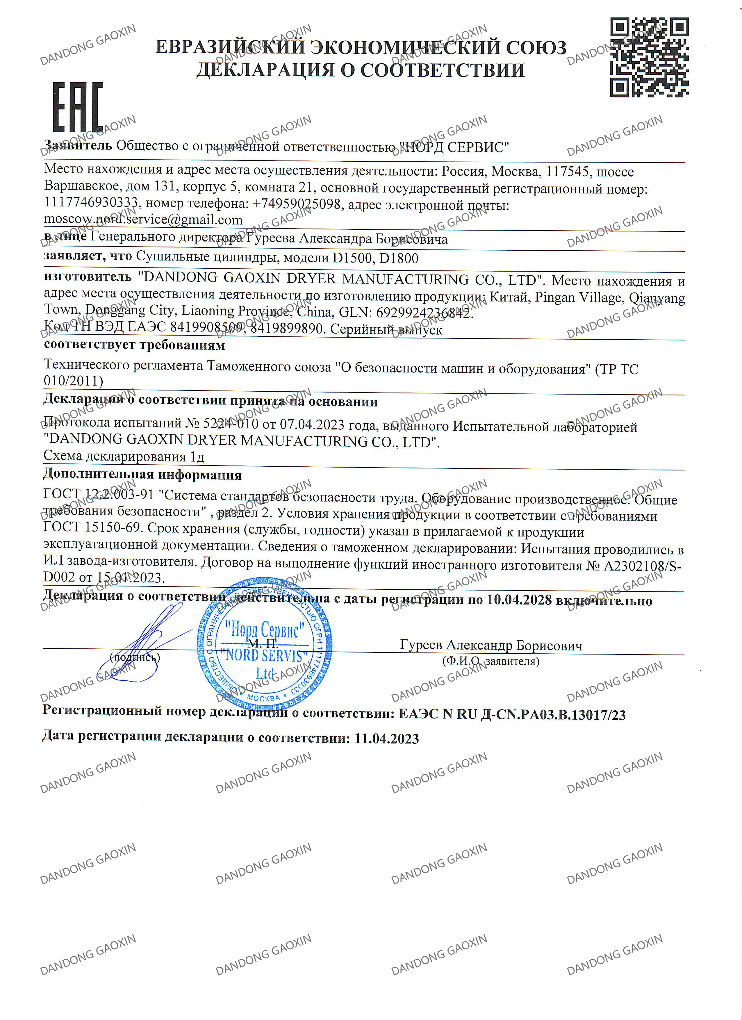 The EAC Certificate (Eurasian Conformity Certificate) is a mandatory certification issued by the Eurasian Economic Union (EAEU, comprising Russia, Kazakhstan, Belarus, Armenia, and Kyrgyzstan) to verify product safety and quality compliance. It serves as a "passport" for products to enter these nations' markets. This certification signifies that DanDong GaoXin Dryer Manufacturing Co.,Ltd has achieved international leading standards in pressure vessel production.